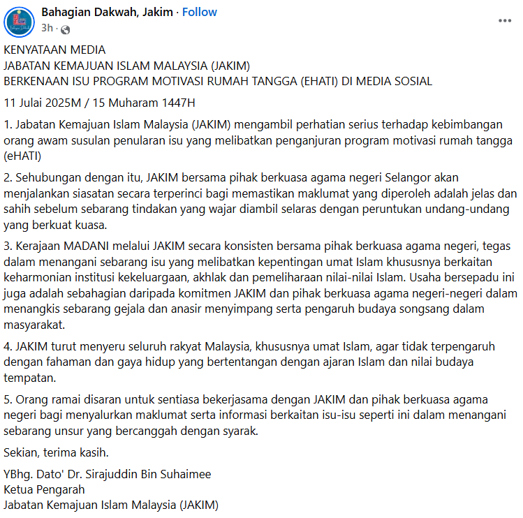 [Terkini] JAKIM telah mengeluarkan kenyataan rasmi berkenaan isu program motivasi rumah tangga e-hati yang bercanggah dengan ajaran Islam ini.